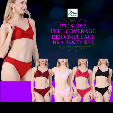 Go gorgeous in seconds as you slip into Pack of 5 Full Coverage Designer Lace Bra Panty Sets that gives a feeling of comfort with its scintillating looks, vibrant colour range and intricate designs. Made from soft and rich fabric, these bras are lightweight, silky soft and comfortable for all day wear. No more second thoughts about ultra chic, body-hugging tops as it comes with full coverage that gives a perfect shape to the body.