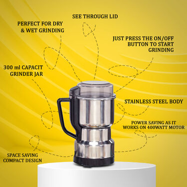 Effortlessly grind daily masalas, dry fruits, and chutneys in just seconds with this portable electric grinder. Its food-grade stainless steel body ensures durability and safety. With a 300ml capacity and 300W motor, it offers efficient grinding performance. The see-through lid allows easy monitoring of the grinding process. Simple to use, just press the on/off button to start grinding. Its compact design saves space and makes it ideal for everyday use. Available in blue and orange colors, it adds a touch of style to your kitchen. Enjoy quick, easy, and power-saving grinding with this convenient appliance