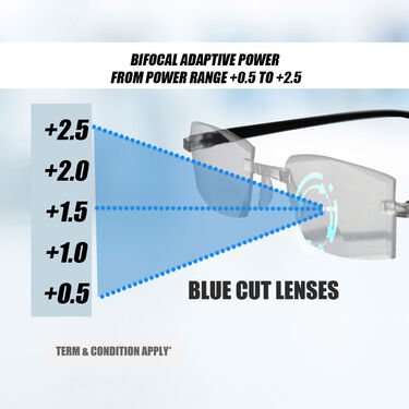 These bifocal rimless adaptive power reading glasses offer clarity for various close-distance tasks, with a power range from +0.5 to +2.5, such as reading, writing, and using digital devices. They also feature zero-power distance bifocal lenses. The blue cut lenses help block harmful blue light from screens, which may reduce eye strain. Additionally, the package includes a free Bluetooth neckband, enhancing convenience and value.Designed exclusively for near vision, they do not correct distance eyesight