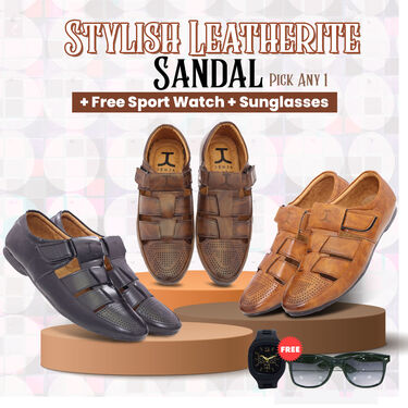 This is a Stylish Leatherite Sandal and a complimentary Sport Watch + Sunglasses Combo (SW63). this deal is a steal for quality seekers. The sandals, available in Black, Dark Brown, and Light Brown, boast a PU upper, EVA Foam insole sock liner, and a slip-resistant PVC outer sole for comfort and style. With a regular fitting, round tip shape, and suitability for various surfaces, these sandals enhance your appearance and boost confidence. The Sport Watch, featuring a sporty pattern, stainless steel case, rubber strap, and a rectangular dial, adds a touch of casual sophistication. It's a compelling deal, providing both style and functionality
